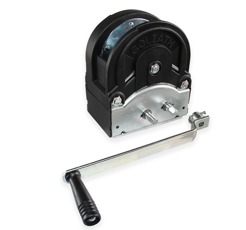 The Goliath TA-TPV winches feature a permanent internal self-brake that activates automatically under load. This mechanism functions independently of the crank, allowing for safe disconnection and preventing unauthorised use by removing the crank.