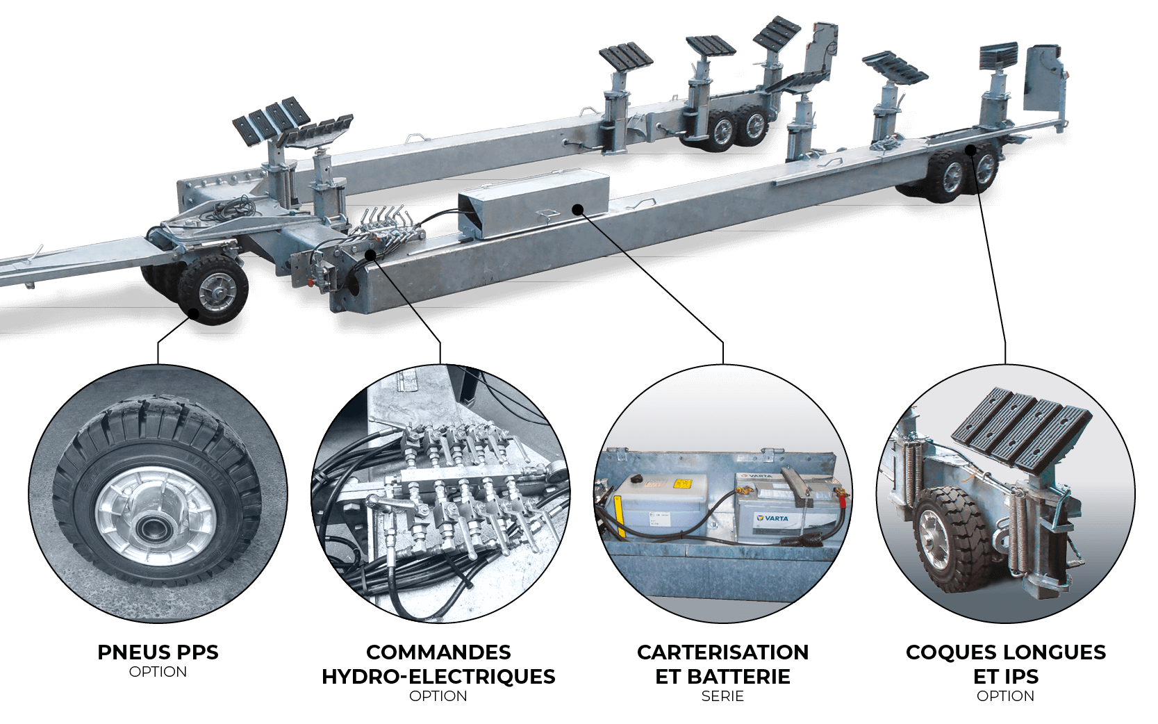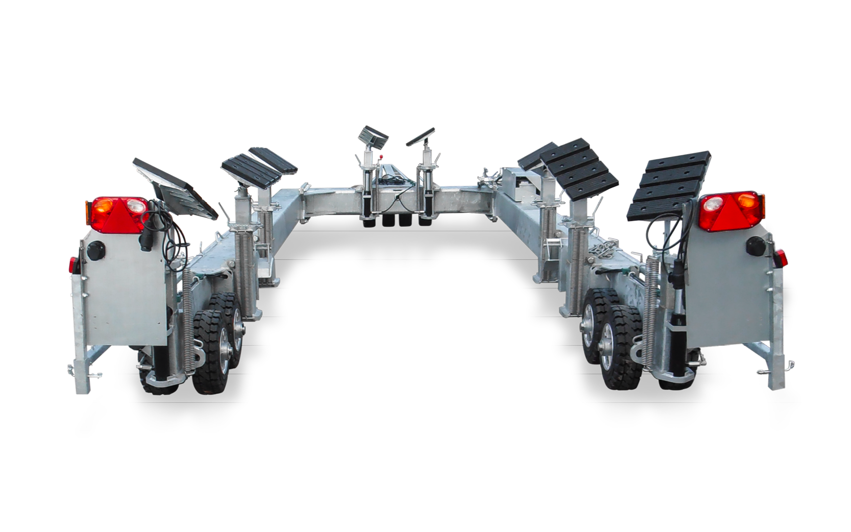 These trolleys are equipped with independent hydraulic stands for handling motorboats and sailboats up to 26T, stored on fixed cradles. Their advantages?