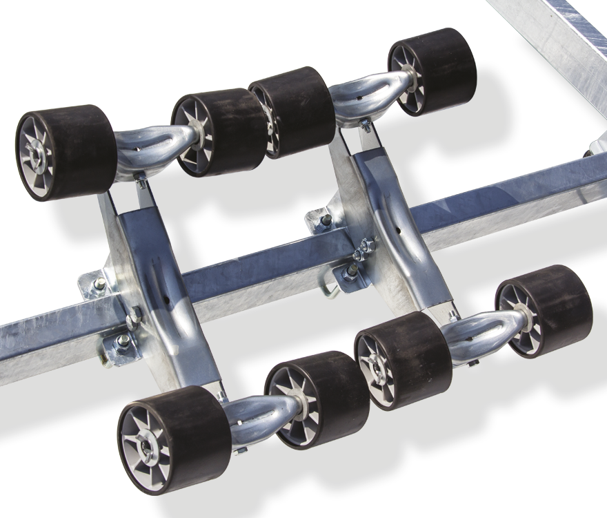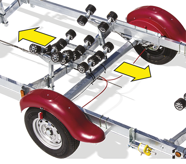 Une remorque bien réglée exerce un juste effort sur l'attelage du véhicule et favorise tenue de route et qualité du freinage.Each boat has a specific construction. The hull, wetted area and engine vary from one boat to another, and have an impact on the launching quality. An easy launching obviously depends on the roller system, but also, for each boat, on several factors such as the centred position of the boat, the winch and winching line, the fact that the boat remains horizontal during the operation (if possible without immersion) and, finally, the position of the rollers according to the hull strakes.