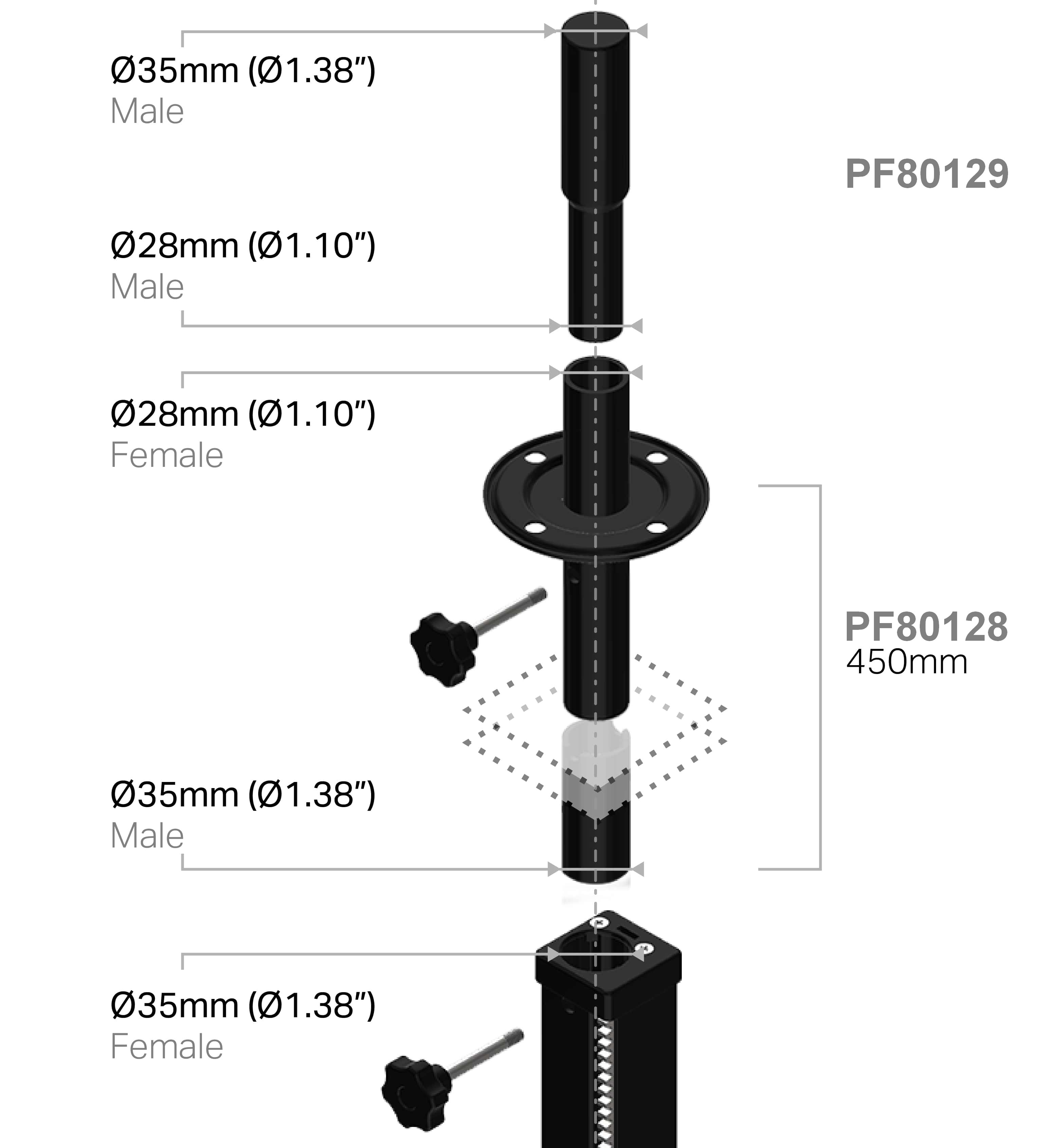 The lifters are supplied with an extention module with a 35mm end convenient for most accessoiries or speaker hole.